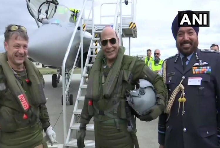 रक्षा मंत्री राजनाथ सिंह ने शस्त्र पूजा के बाद पहले राफेल विमान में भरी उड़ान