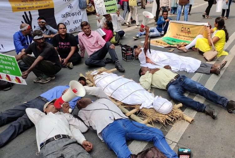 महात्मा गांधी के समाधि स्थल राजघाट पर गुरुवार दोपहर कुछ लोग 'कफन' पहन कर पहुंच गए और अपने अधिकारों की मांग करने लगे।